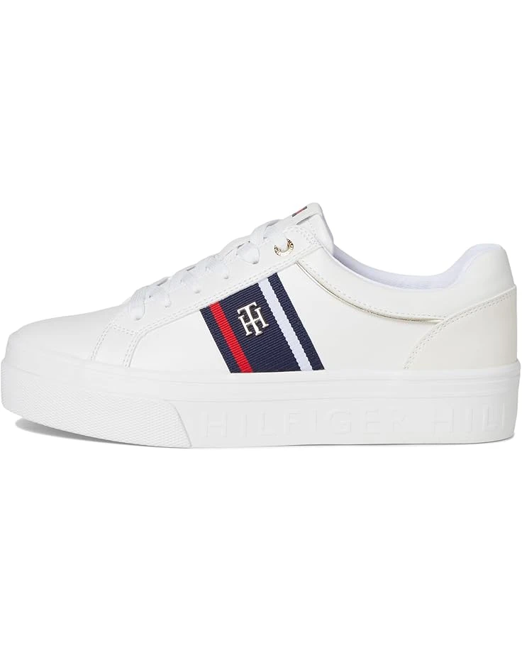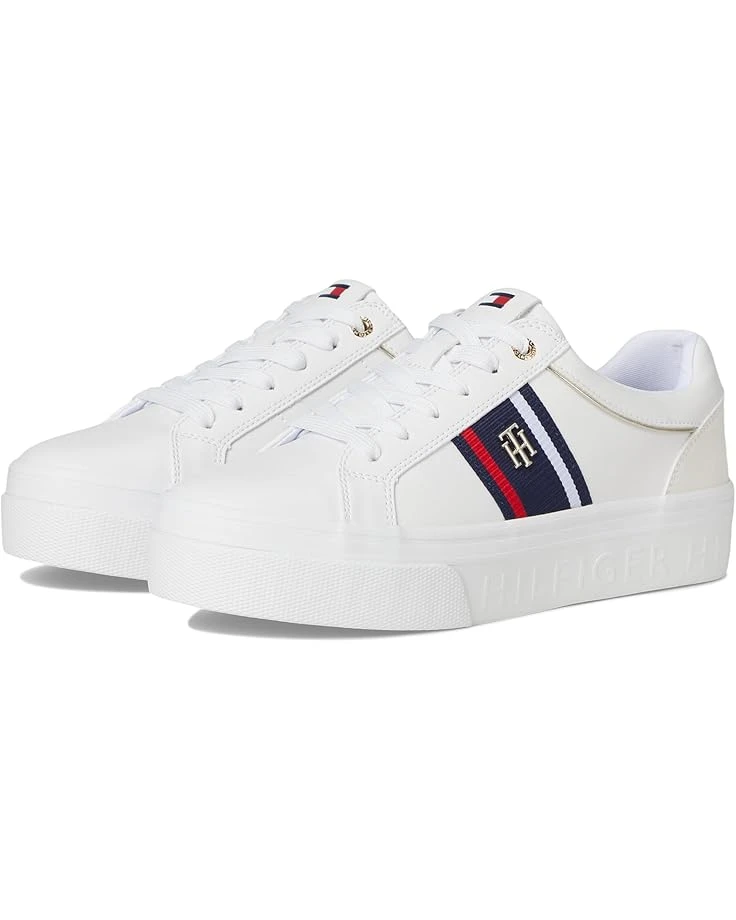 - Stylish and comfortable, the Tommy Hilfiger® Badria Sneakers add a touch of sporty glamour to almost any look and will be a great addition to your wardrobe. The low-top, round-toe sneakers are designed with a polyester upper, polyester lining, and polyester insole. The branded logo hardware and signature ribbon offer authenticity and the lace-up closure ensures a secure fit.