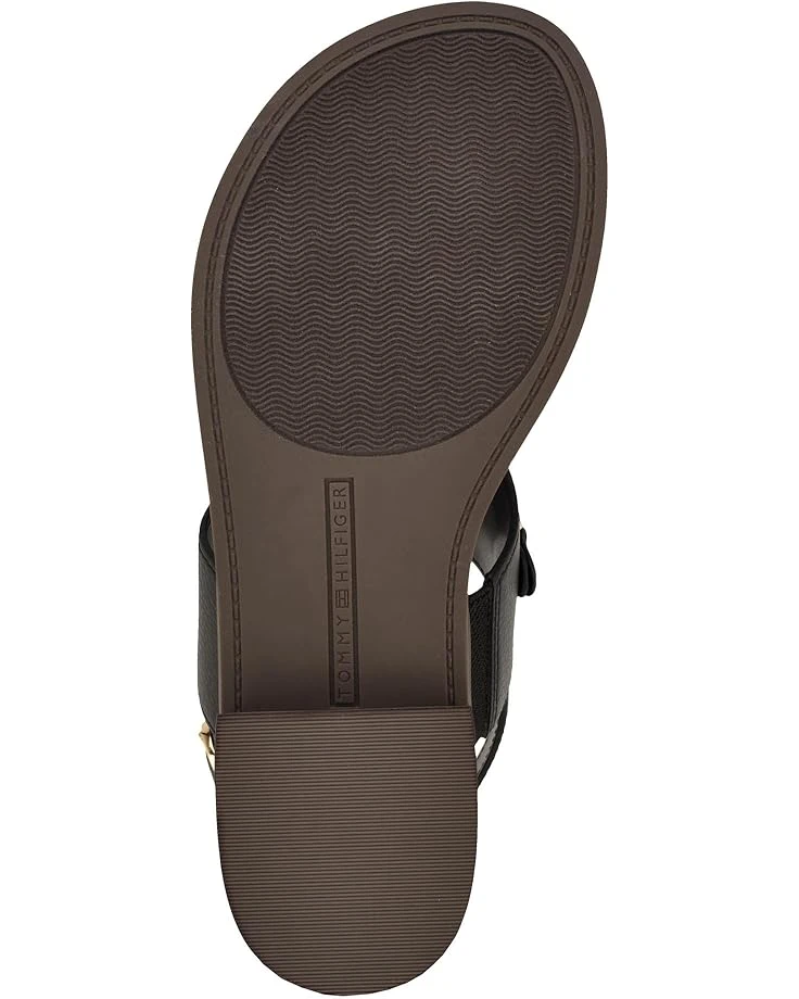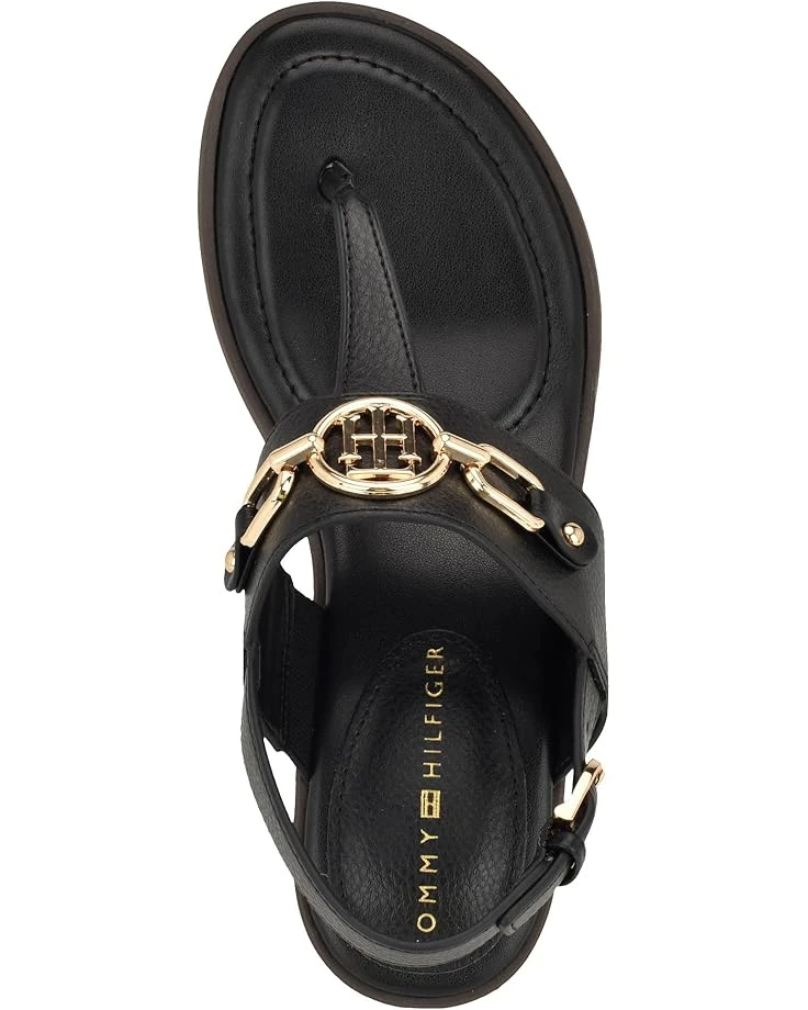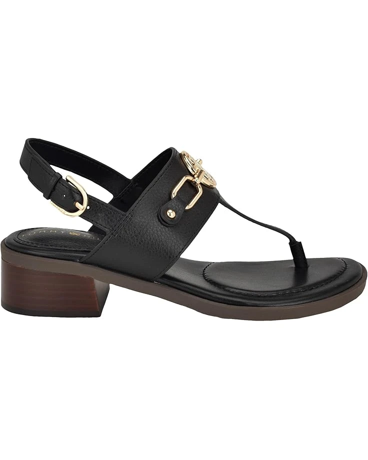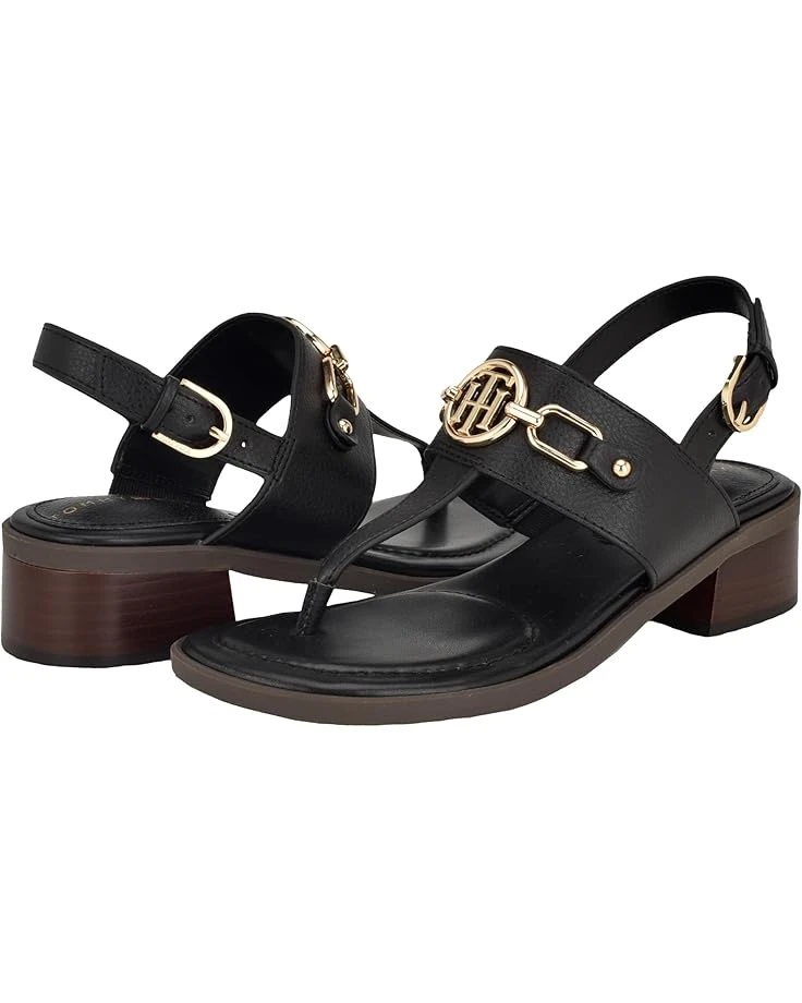 - Take graceful steps wearing the Tommy Hilfiger® Ezmeai. Crafted from man-made upper, lining, and comfortable foam footbed, this pair of heels features open almond toe, adjustable buckled closure, block heel, gold chain logo hardware on the top, and brand detailing on the footbed.