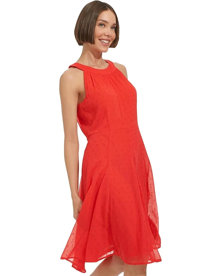 - A perfect piece to add to your warm weather wardrobe, the Tommy Hilfiger® Fit and Flare Dress will not disappoint. This printed dress is styled with flutter cap sleeves, a V-neckline, and a ruffled hem. The lightweight and breathable chiffon fabrication of the dress keeps you comfortable at all times. One of the highlights of the dress is its ruffle detail at the front and back. Fully lined, this midi dress comes with a zippered back closure for easy on and off. Flaunt your great style wearing this chiffon dress.