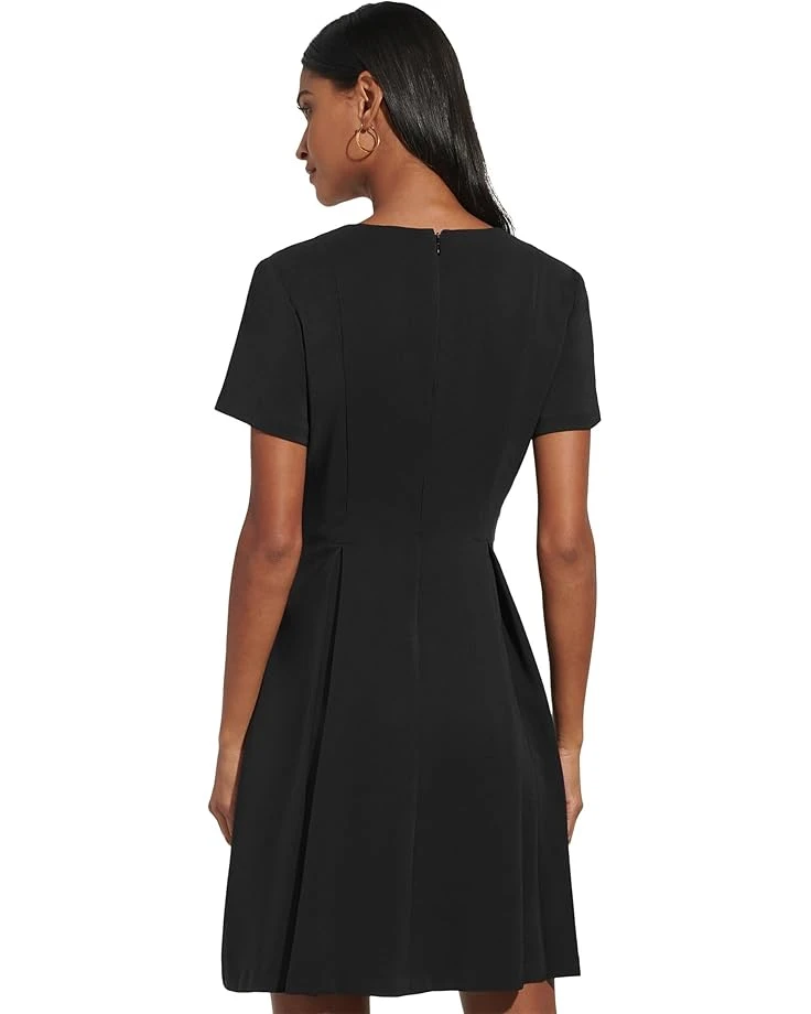 - Get ready to turn heads in the Tommy Hilfiger® Fit And Flare dress. Crafted with lightweight salon stretch material, this dress showcases a chic V-neckline, short sleeves, and a charming pleated skirt. The fit-and-flare silhouette is designed to enhance your shape, making you look and feel confident all day long.