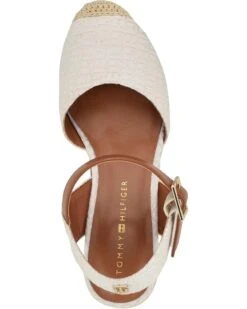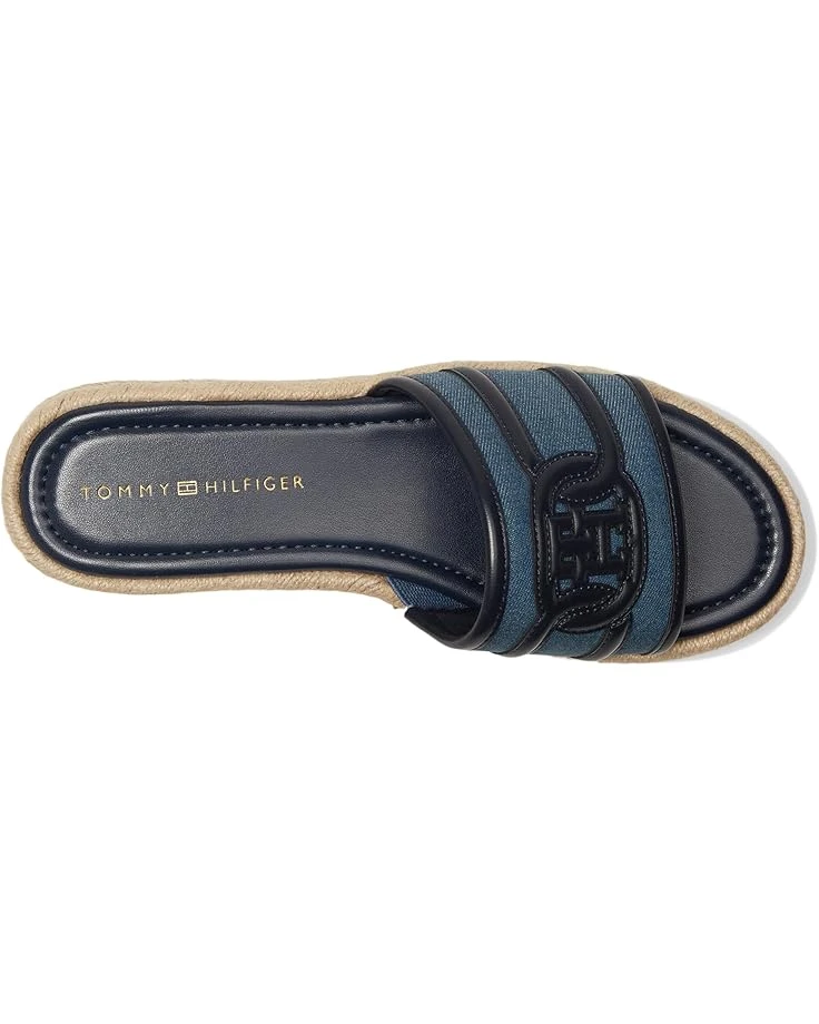 - The Tommy Hilfiger® Women’s Hadjea with a dimensional logo stands out atop the one band vamp of this espadrille-inspired sandal lifted by a subtle, jute-wrapped platform. Crafted from polyester upper, lining, and leather insole, this pair of footwear features open round toe, slip-on style, and low-top silhouette.