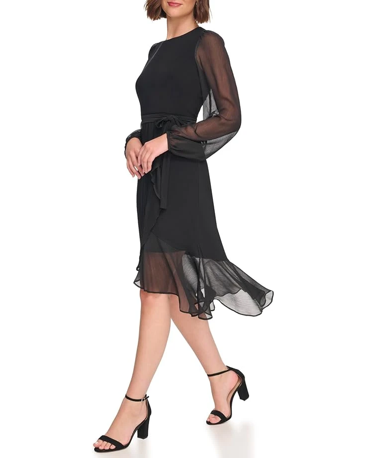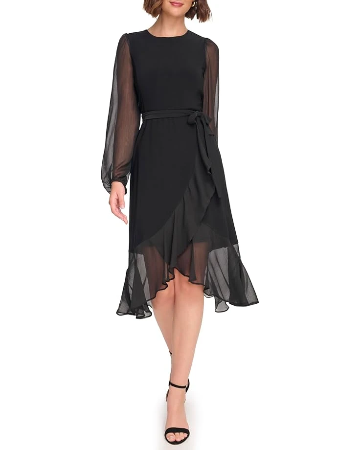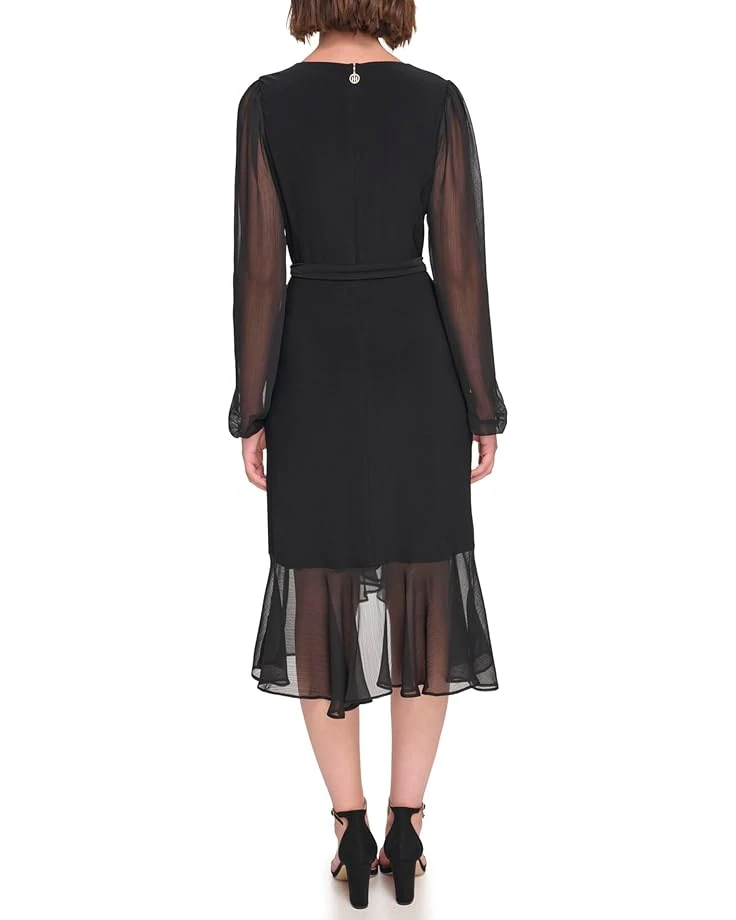 - Experience the perfect blend of elegance and playfulness with this charming wrap silhouette Tommy Hilfiger® Jersey Midi with Chiffon Sleeve and Ruffle Hem dress. It features crew neck and long sheer chiffon fabric sleeves with elasticized cuffs.