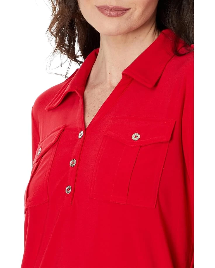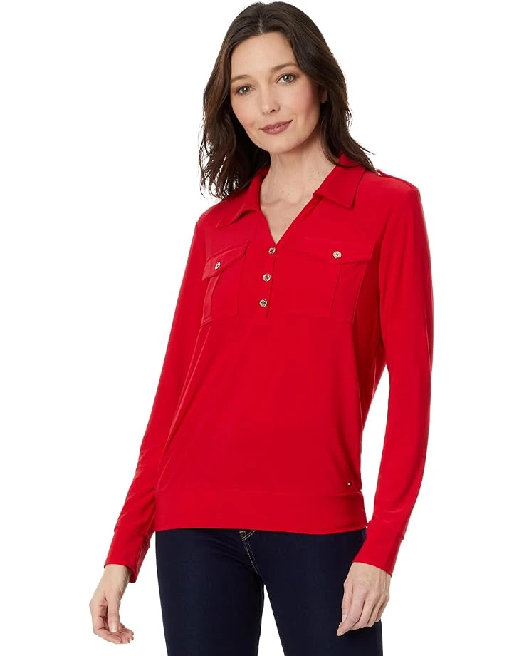 - Coming in bright, solid hues, the Tommy Hilfiger® Long Sleeve Utility Top is versatile enough to be paired with any style and outfit. It is fashioned with a collared neckline with three-button front placket, long sleeves with banded cuffs, buttoned detailing on shoulders, and two button-flap chest pockets.