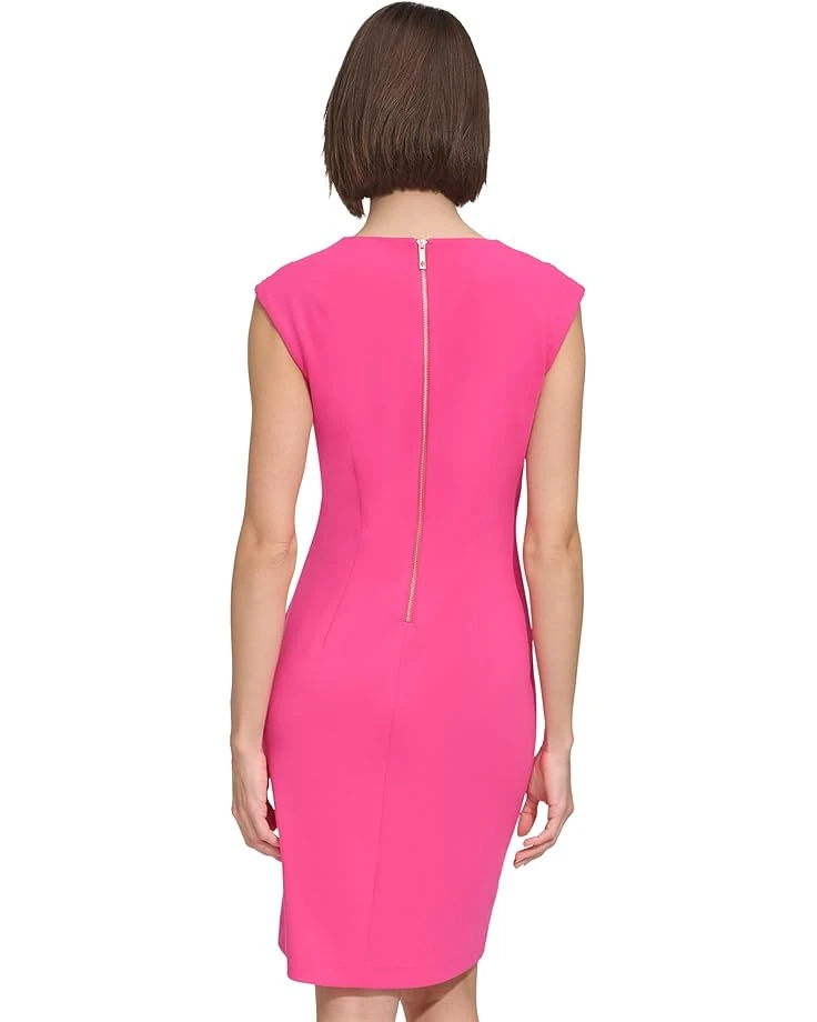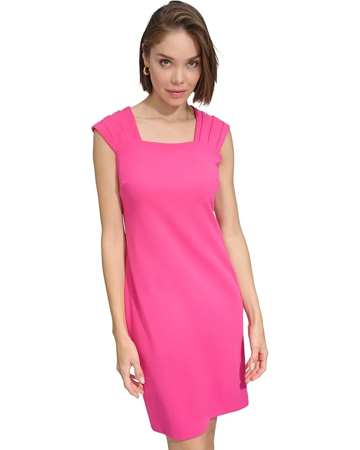 - The Tommy Hilfiger® Pleated Shoulder Sleeveless Sheath Dress is sure to become your favorite go-to garment for fun dayouts with friends. The sheath dress features a scuba crepe construction, a squared neck, sleeveless design, buttoned detailing on the shoulders, back zipper closure, a classy solid pattern, and a knee-length silhouette.
