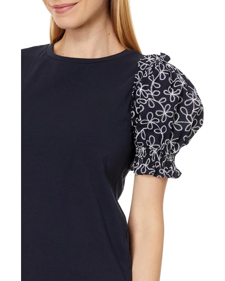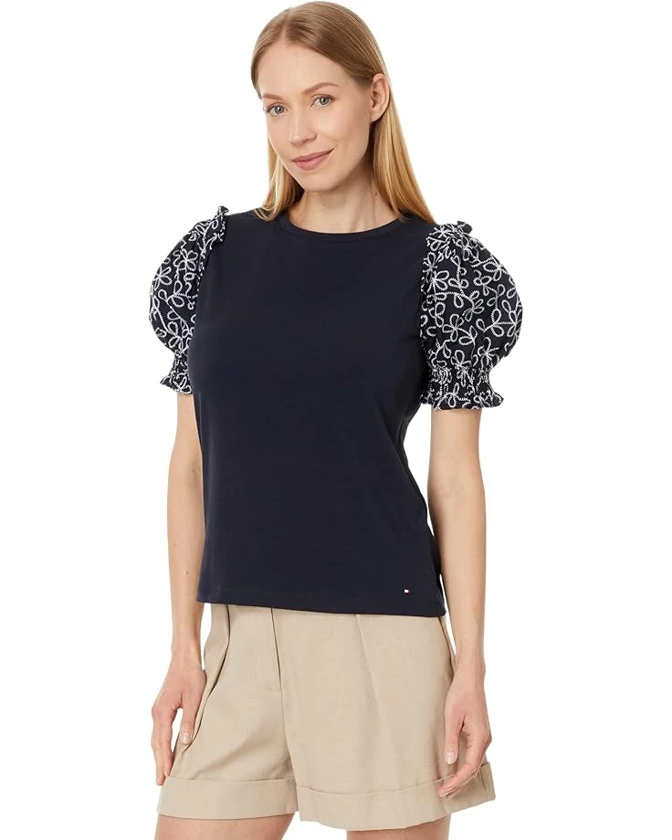 - Styled with woven embroidered short puff sleeves, the Tommy Hilfiger® Short Sleeve Mixed Media Top serves as a great choice for casual parties and events. The crew neckline and straight hem offer a stylish appeal. This stylish top is crafted from a cotton blend that takes your comfort to the next level. A stylish addition to your wardrobe, this cotton top will become your all-season favorite.