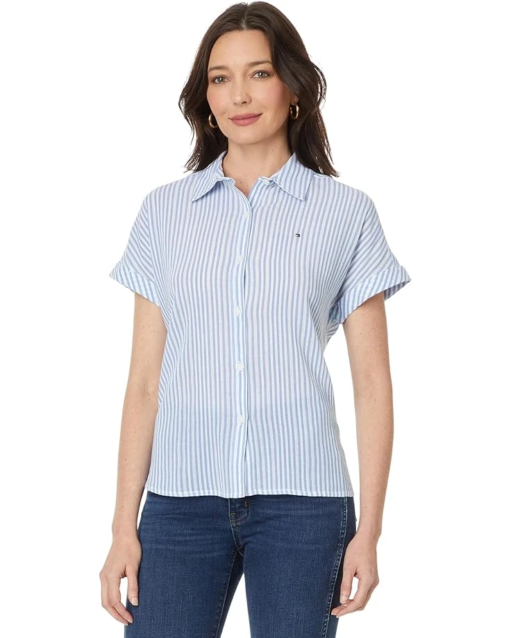 - Perfect to match your casual and formal looks, the Tommy Hilfiger® Short Sleeve Stripe Camp Shirt is a must-have for your wardrobe. The cotton fabric of the shirt offers all-day comfort while the buttoned front closure ensures easy wear. This button-down shirt comes with short sleeves, a collared neckline, and a straight hem. Comfortable and stylish, this collared shirt is perfect to pair with trendy denim and trousers.