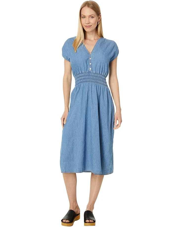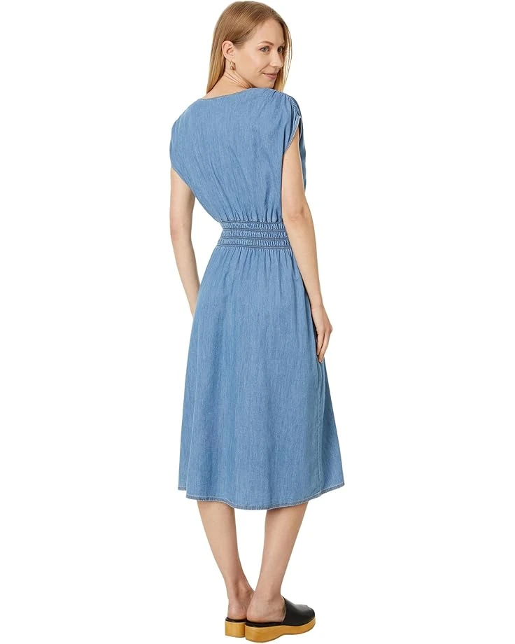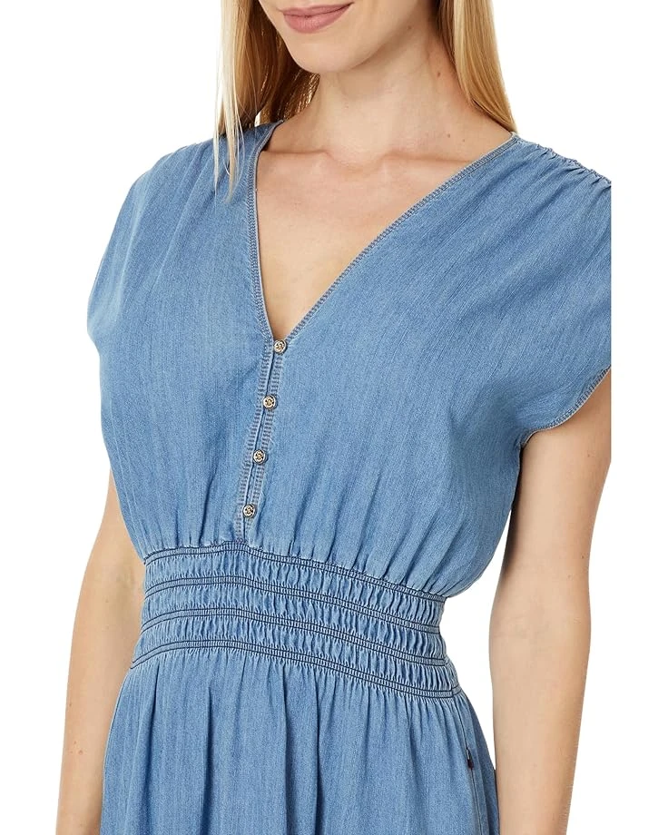 - Give a sleek and sophisticated touch to your casual style by donning the Tommy Hilfiger® Sleeveless Smocked Chambray Dress, crafted in a flowy silhouette with smocking at the waist. The pull-on style dress features a V-neckline, half-button closure on the front with brand logo detailed buttons, sleeveless design, a solid pattern, and an above-the-knee silhouette.