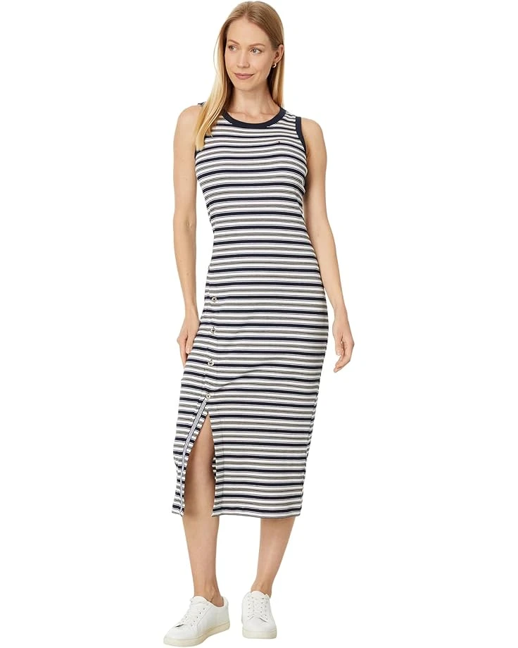 - Look confidently chic wearing the sanguine Tommy Hilfiger® Sleeveless Stripe Midi Dress. It features a rib-knit crew neckline, sleeveless design, and logo buttons along the front slit.