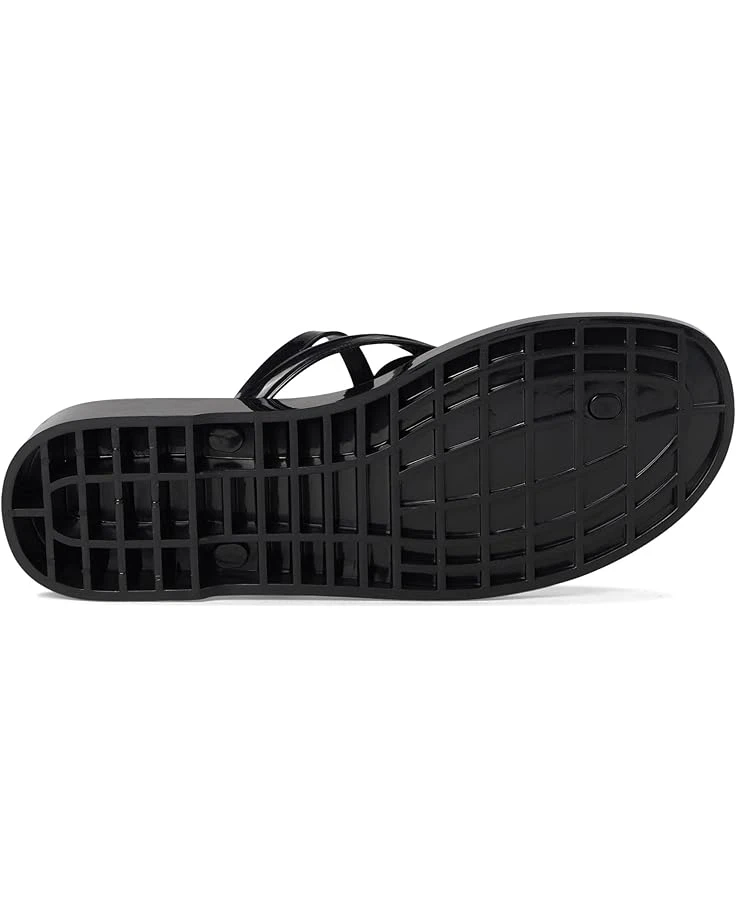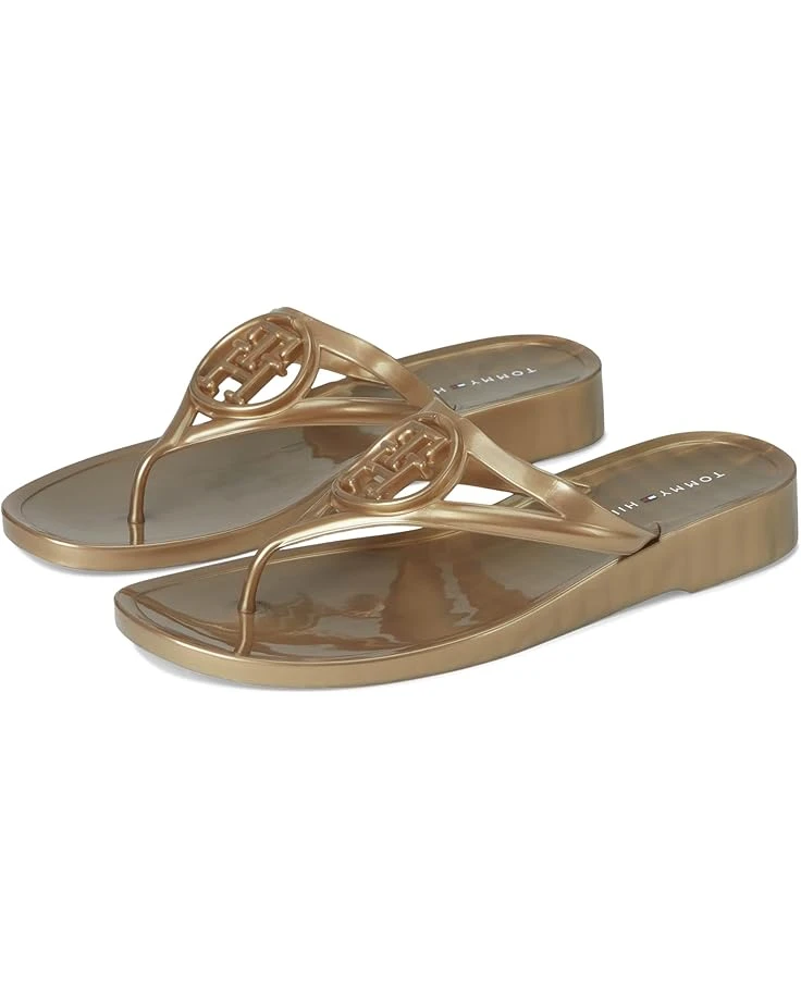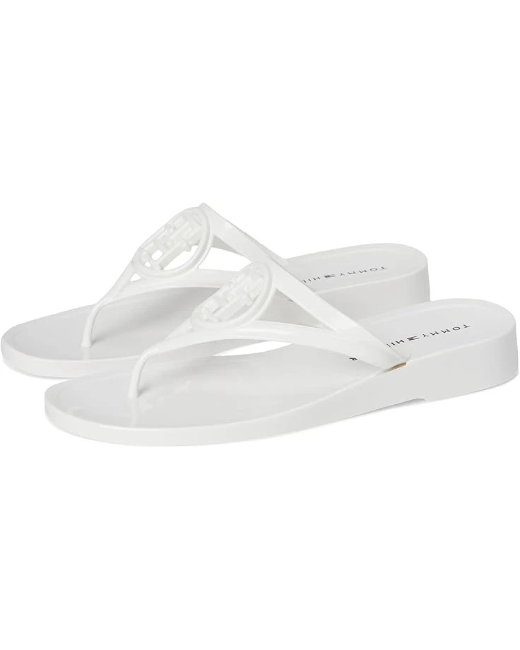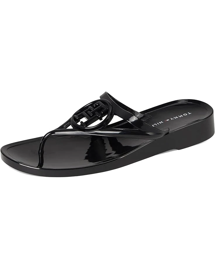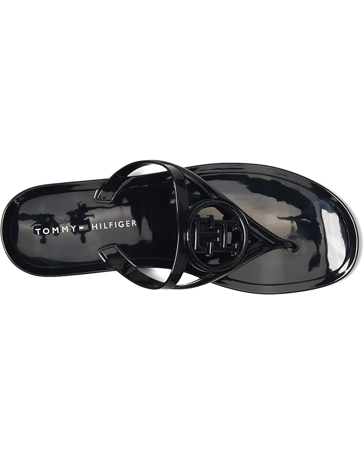 - The Tommy Hilfiger® Women’s Vedna jelly flip-flop with a low edge and instantly recognizable logo perfectly balances this signature style with a fresh attitude. Crafted from polyester upper, lining, and leather insole, this pair of sandals features open square toe, slip-on style, low-top silhouette, and brand detailing on the footbed.