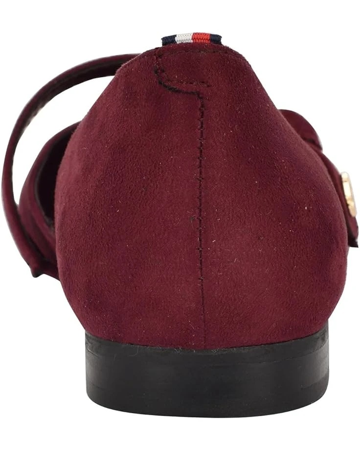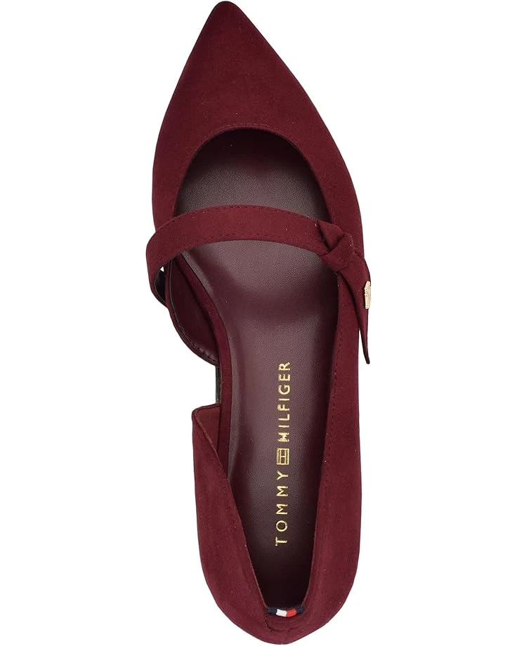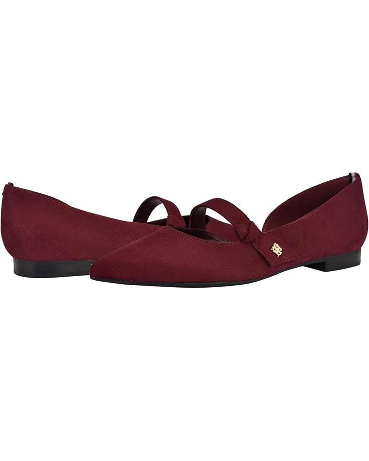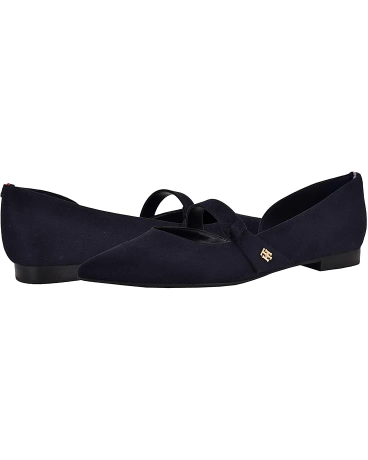 - The Tommy Hilfiger® Venny 2 is sure to make any outfit pop! Crafted from PU upper, polyester lining and polyurethane insole, this pair of sandals features pointed toe, flat heel, and slip-on style with hook-and-loop closure. The signature stripe ribbon up the inside of the back counter and small gold branded grommet give the subtle branded touches to enhance your look. You can dress up or down any outfit with these flats.
